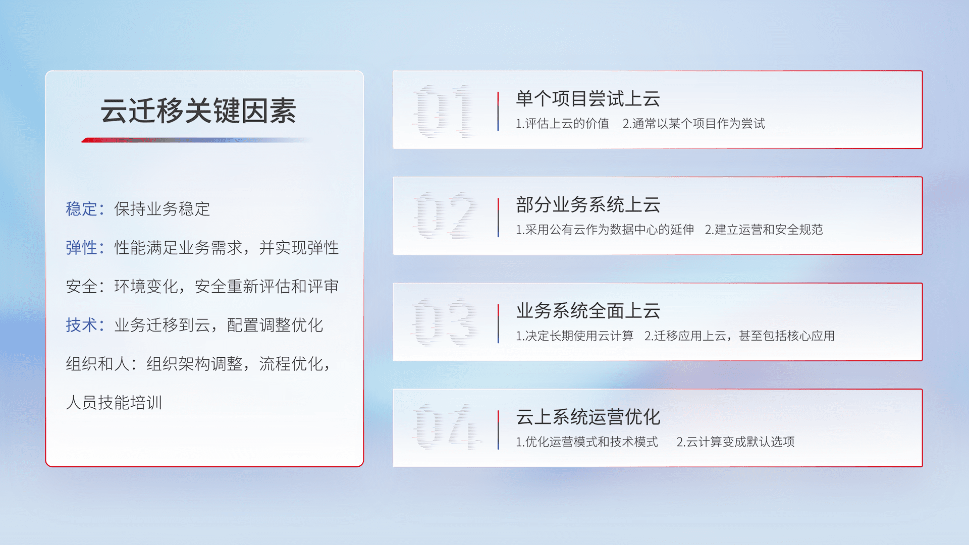 结合实际业务,,,,从规划设计、、、、云平台选型、、、、云原生改造、、、、数据迁移、、集成交付,,,,迁移全过程为客户识别最佳上云路径,,做好风险识别管理,,,,设计网络架构、、、、身份权限、、、、安全审计合规、、操作审计、、、日志审计、、、、监控告警策略、、、、多站点容灾设计等,,,,对云上基础设施进行整体规划,,提升IT治理水平,,以满足弹性、、高可用、、、、高性能的需求。。。